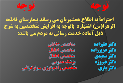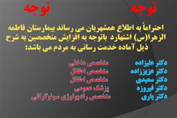 به اطلاع عمومی مردم شریف و شهید پرور شهرستان اشتهارد می رساند: حضور متخصصین جدید الورود در بیمارستان فاطمه الزهرا(س)