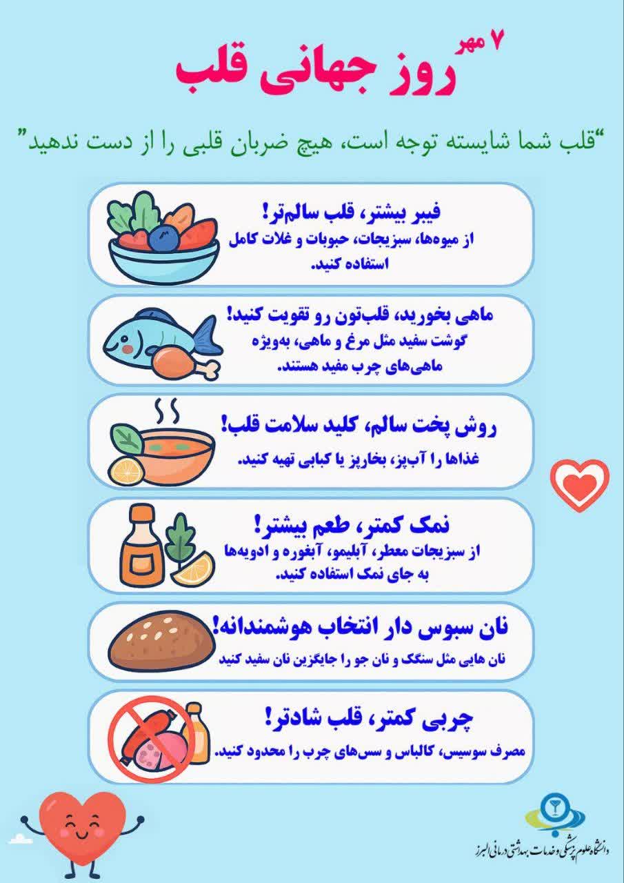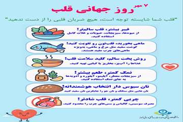 ۷ مهرماه مصادف با ۲۹ سپتامبر که نامگذاری شده برای روز جهانی قلب است، بهترین زمان یادآوری برای اهمیت سلامت قلب و عروق انسان است.در جهان بیشتر مرگ و میرها بر اثر بیماری های قلب و عروق صورت می گیرد.توجه به عواملی که باعث به خطر افتادن سلامت این عضو مهم بدن می شود و انجام اقدامات پیشگیرانه می تواند باعث افزایش سلامت قلب و عروق شود.